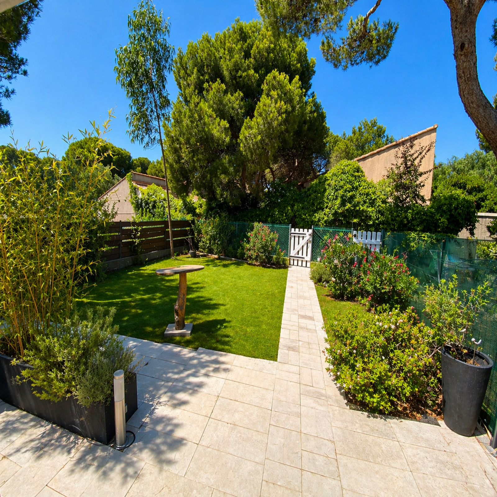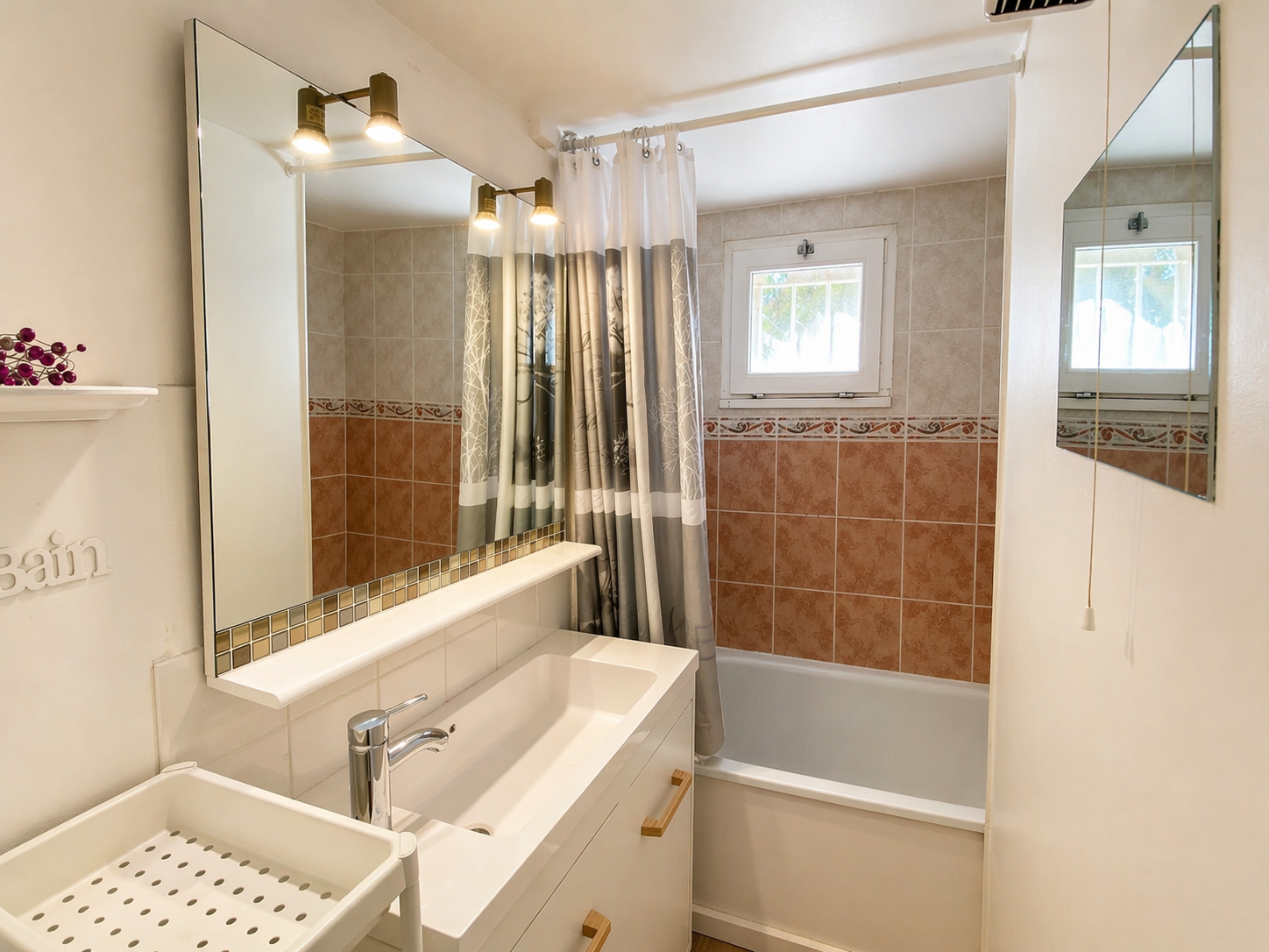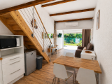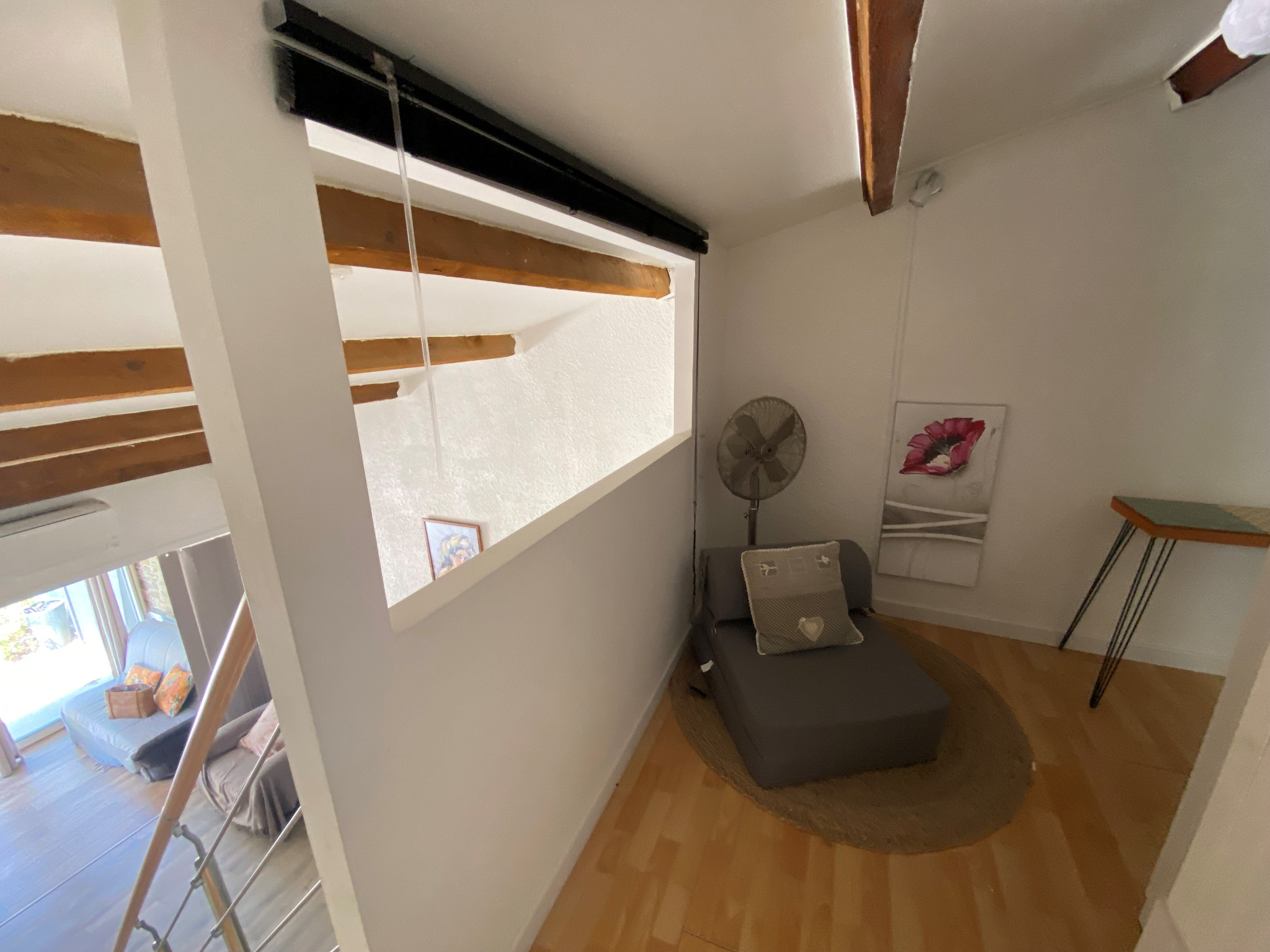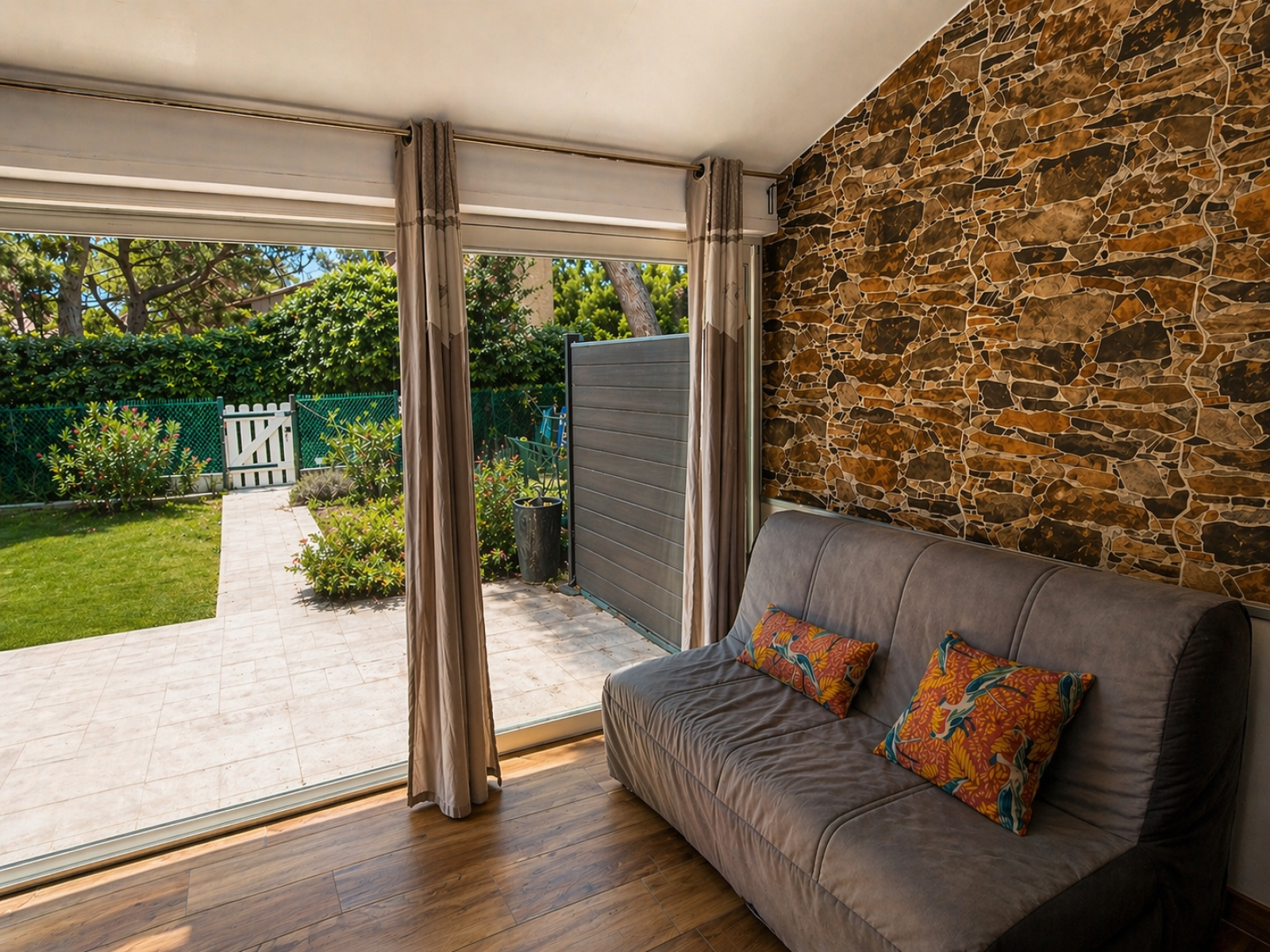 Il se compose d'un séjour avec cuisine donnant sur une terrasse et jardin (environ 90m²) exposée Sud, une chambre, un coin nuit avec deux couchages supplementaires , une salle d'eau. Climatisation , double vitrage.